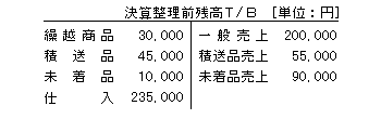資料から,期首商品(繰越商品30,000円,積送品4,000円,未着品8,000円)42,000円を求めP/Lに記入し,差額で当期仕入を求めます。 ※1 委託販売は期末一括法なので,A積送品売上原価とC期末積送品の合計額は45,000円。 ※2 未着品はその都度法ですので借方にある未着品勘定が期末未着品の金額です。 ![]() ![]() 手許商品は資料より25,000円。 未着品は※2より10,000円。 積送品は期末一括法ですので借方にある積送品勘定45,000円から積送品の売上原価40,000円をマイナスすると期末積送品5,000円の金額となります。 |